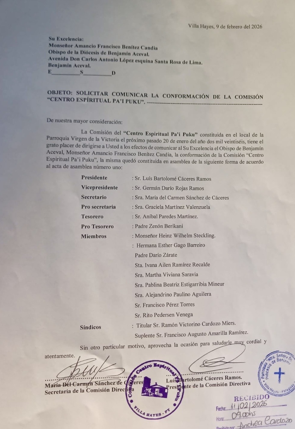 SOLICITUDES DE RECONOCIMIENTO OFICIAL DE LA NUEVA COMISIÓN CENTRO ESPIRITUAL PAI PUKU AL OBISPO MONS. AMANCIO BENÍTEZ Y AL INTENDENTE DR. LUIS LÓPEZ